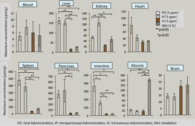 MiZ has extensively studied the H2 concentration in tissue when H2 water (1.25~5 ppm) or H2 gas (1~4 %) is administered to rats by various administration routes (oral administration, intraperitoneal